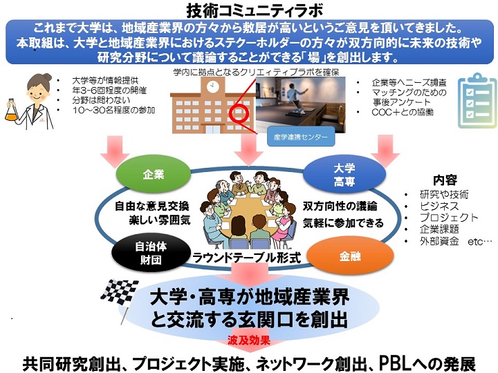 技術コミュニティラボは,少人数&双方向性の情報交換の「場」であり, 情報提供者である大学教員等と産業界を結びつけ地域における大学の垣根を低くするとともに, 産学官連携をベースとしたイノベーションを創出するための新たな取り組みです。 |
